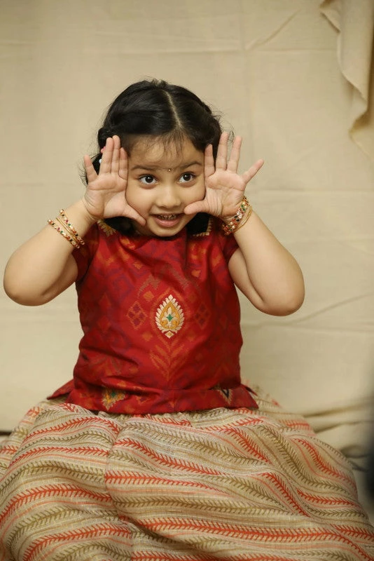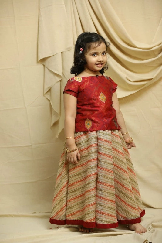 Kota stripe beige skirt with red border and red banarasi satin silk top.