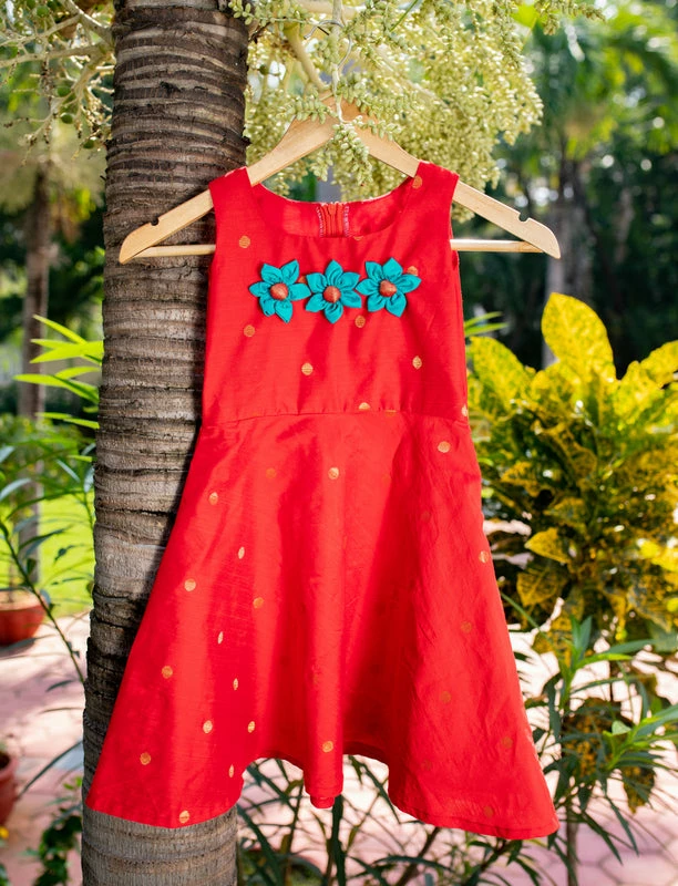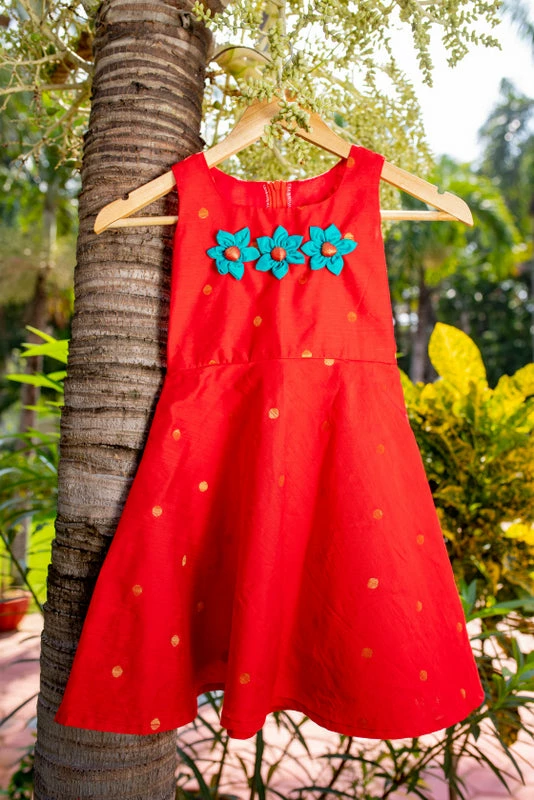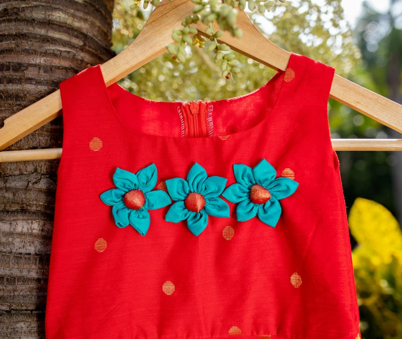 A cute sleeveless Zari Butta Frock with hand-made fabric flowers.