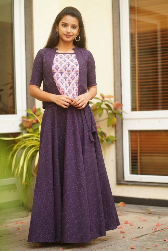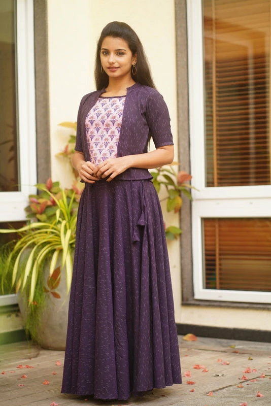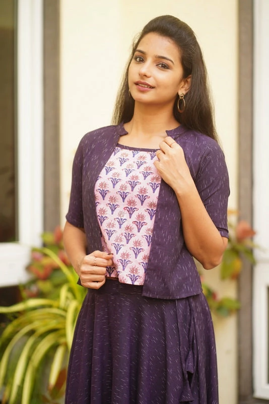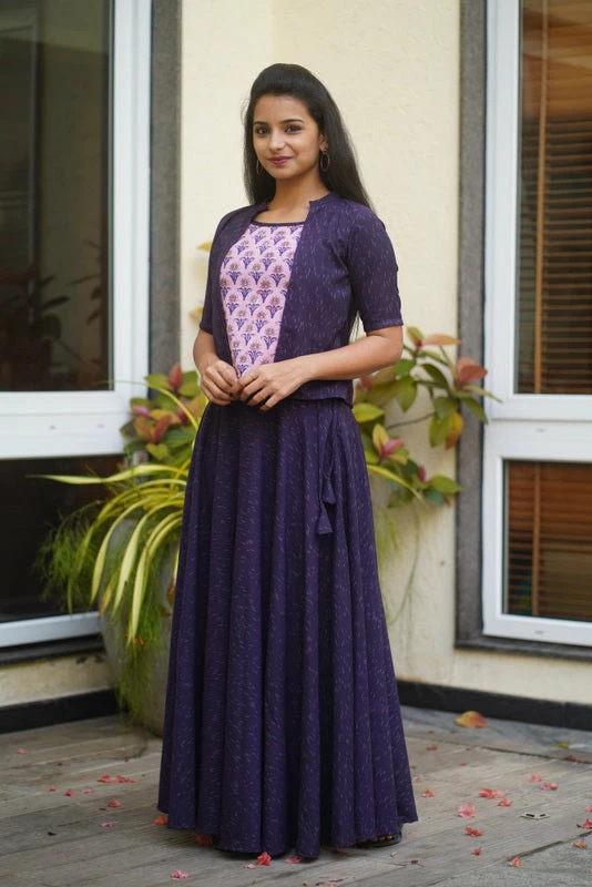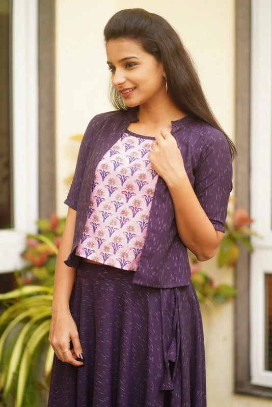Cotton Ikat flared skirt paired with block print overlay crop top.
