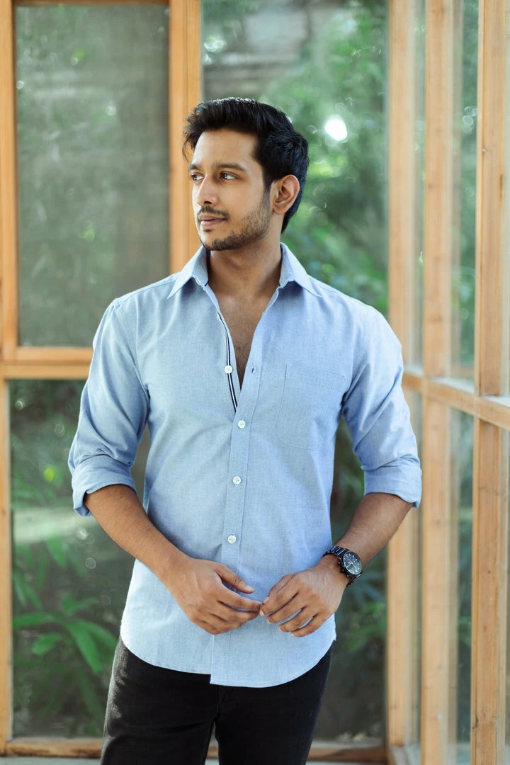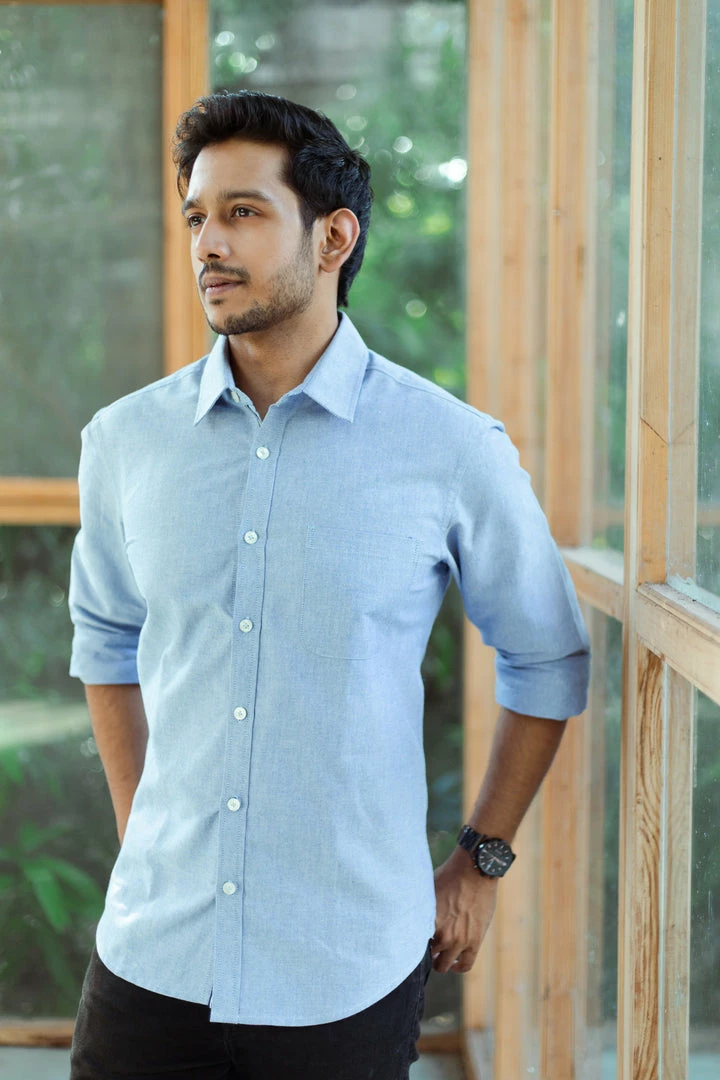 This Wabi Sabi Co. creation is a smart Oxford blue shirt, perfect for work or a fun evening with your clan!Â