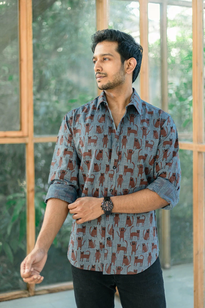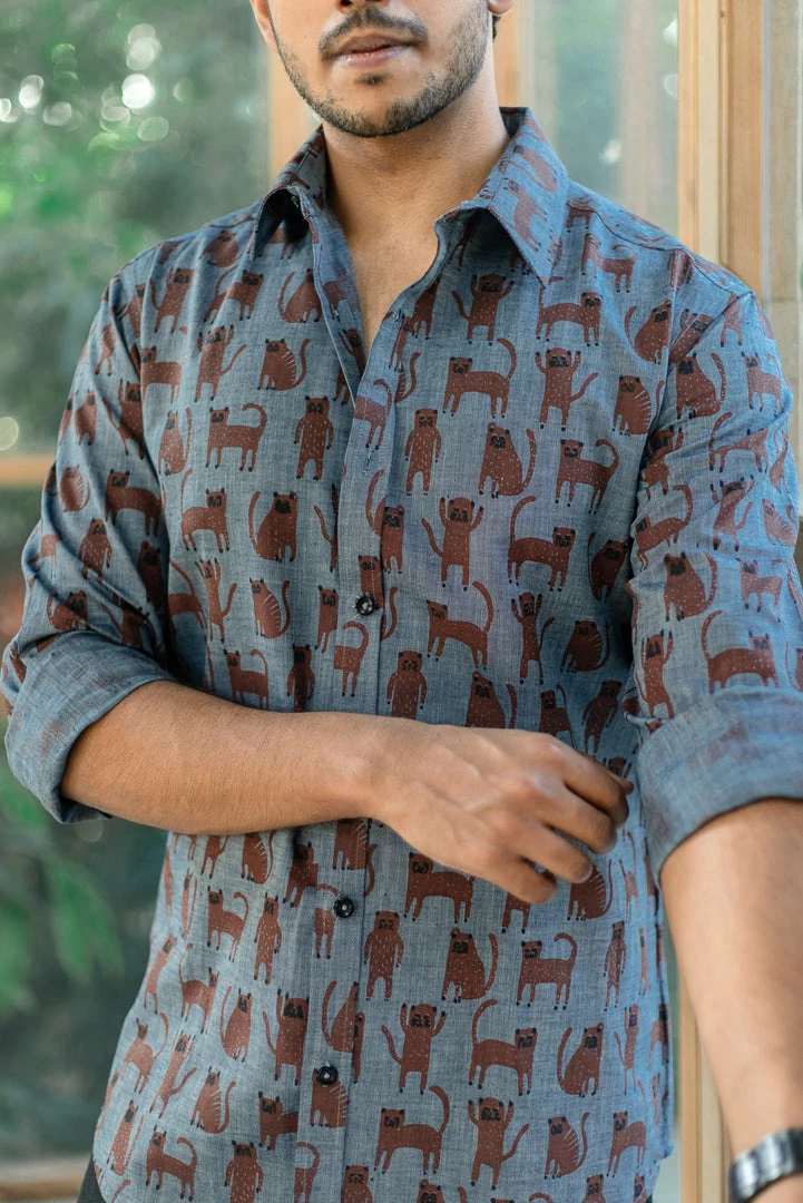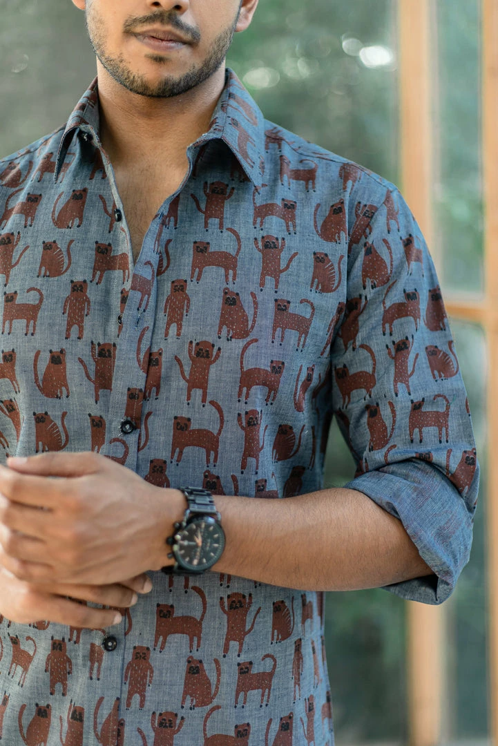 This Wabi Sabi Co. creation is a soft denim shirt with quirky cat print all over, perfect for a party shirt or a fun evening with your clan!