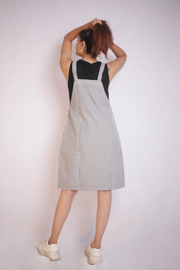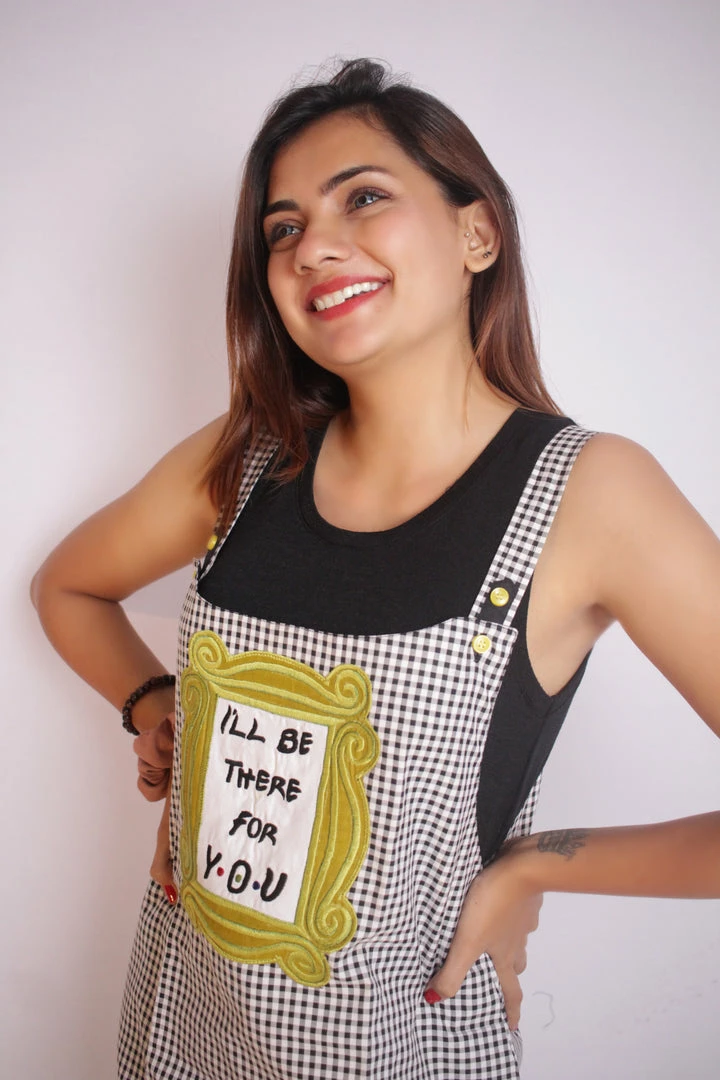 Featuring a gingham dungaree dress with friends applique and yellow buttons detailing.