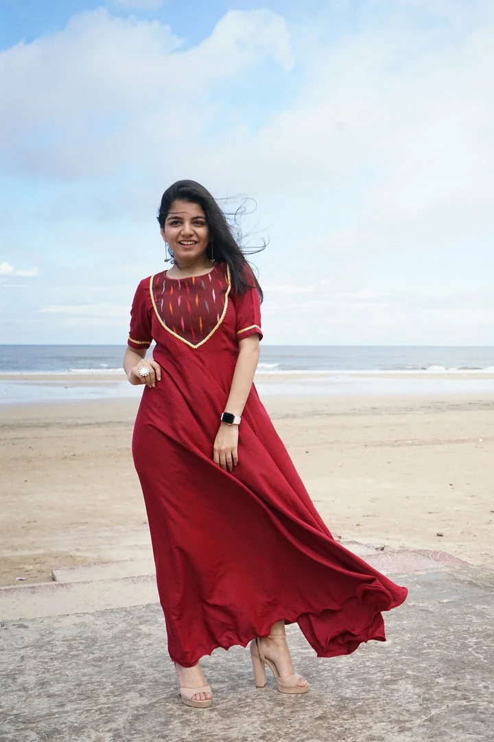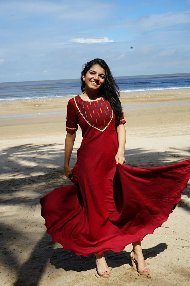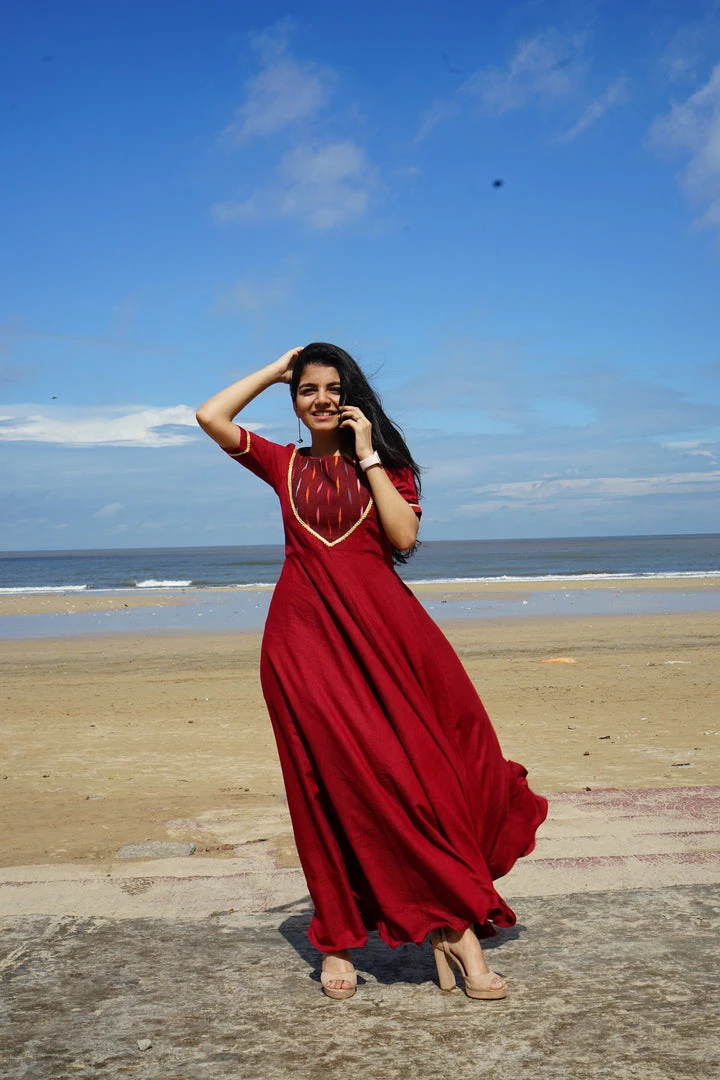 Flared and voluminous maroon maxi dress for this festive season with traditional gotta lace on neck.The flare adds an elegant touch to the sophisticated and beautiful dress.