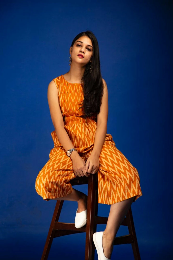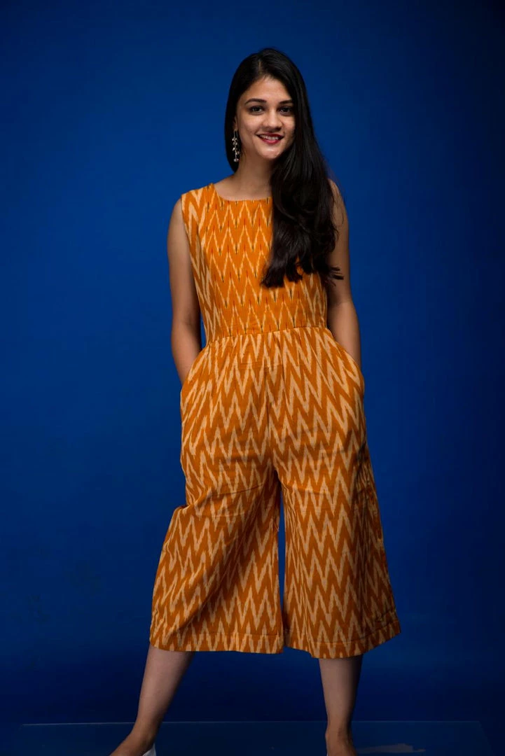 Featuring a simple and elegant mustard-white handwoven ikat jumpsuit with two side pockets and tassels in yoke.