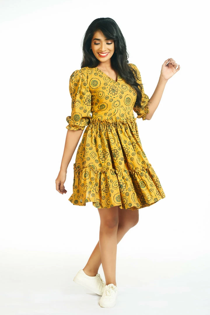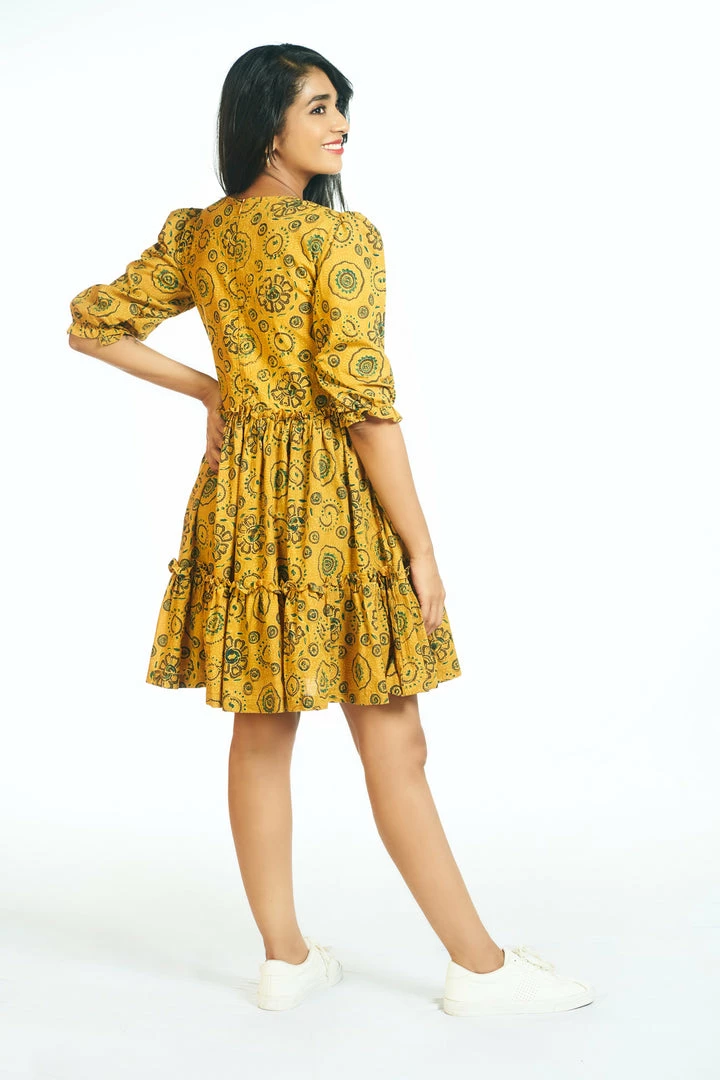 Crafted in Ajrakh cotton fabric and features a V neck and a puff 3/4th sleeves with a ruffle at the end. Pair this dress with a pair of heels and a sling bag to give it a perfect chic look