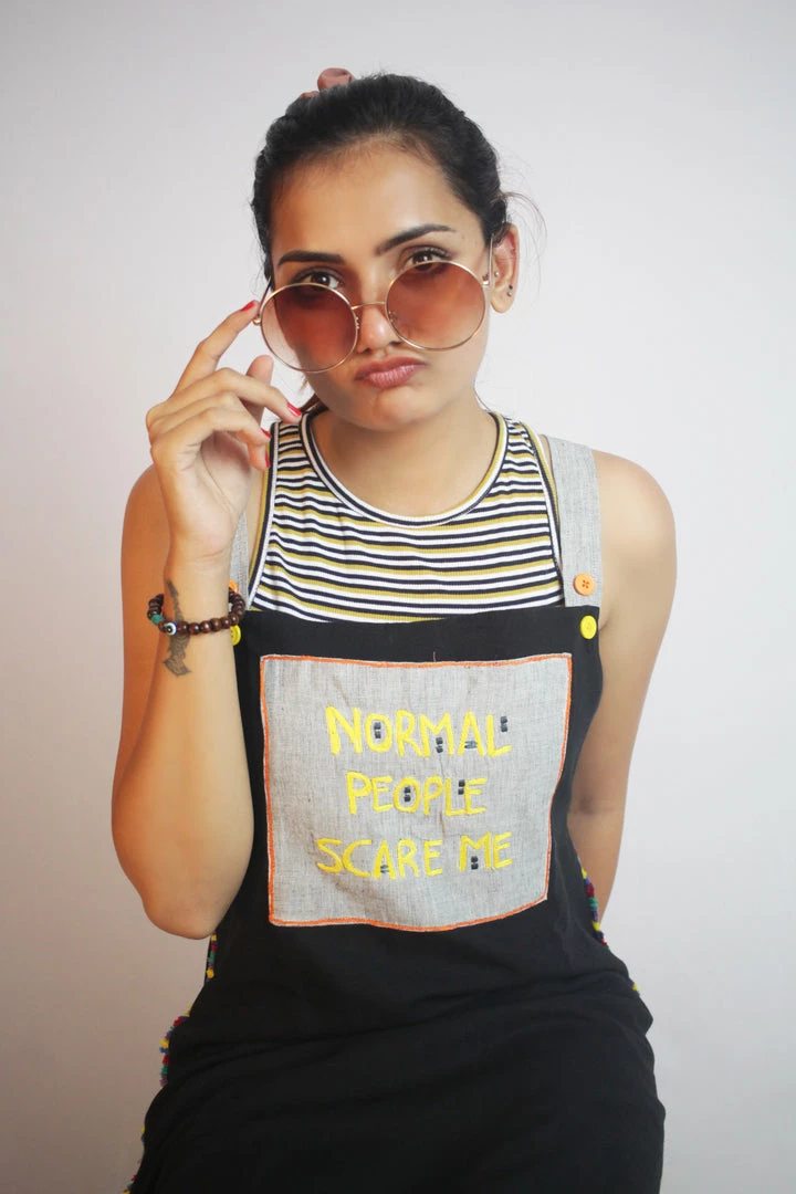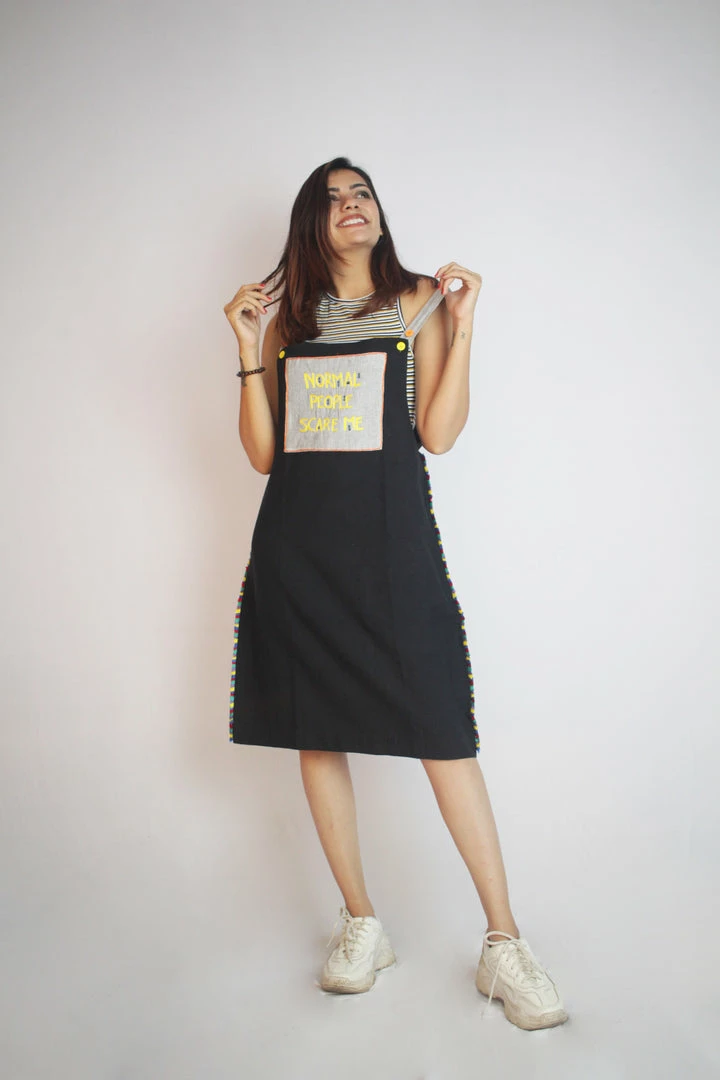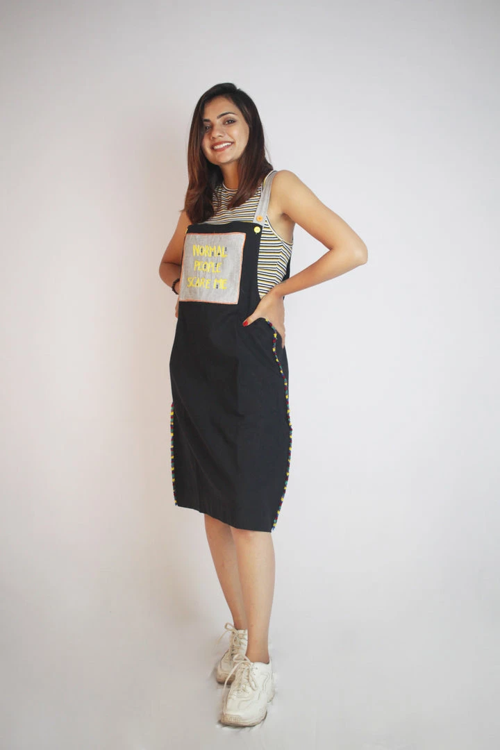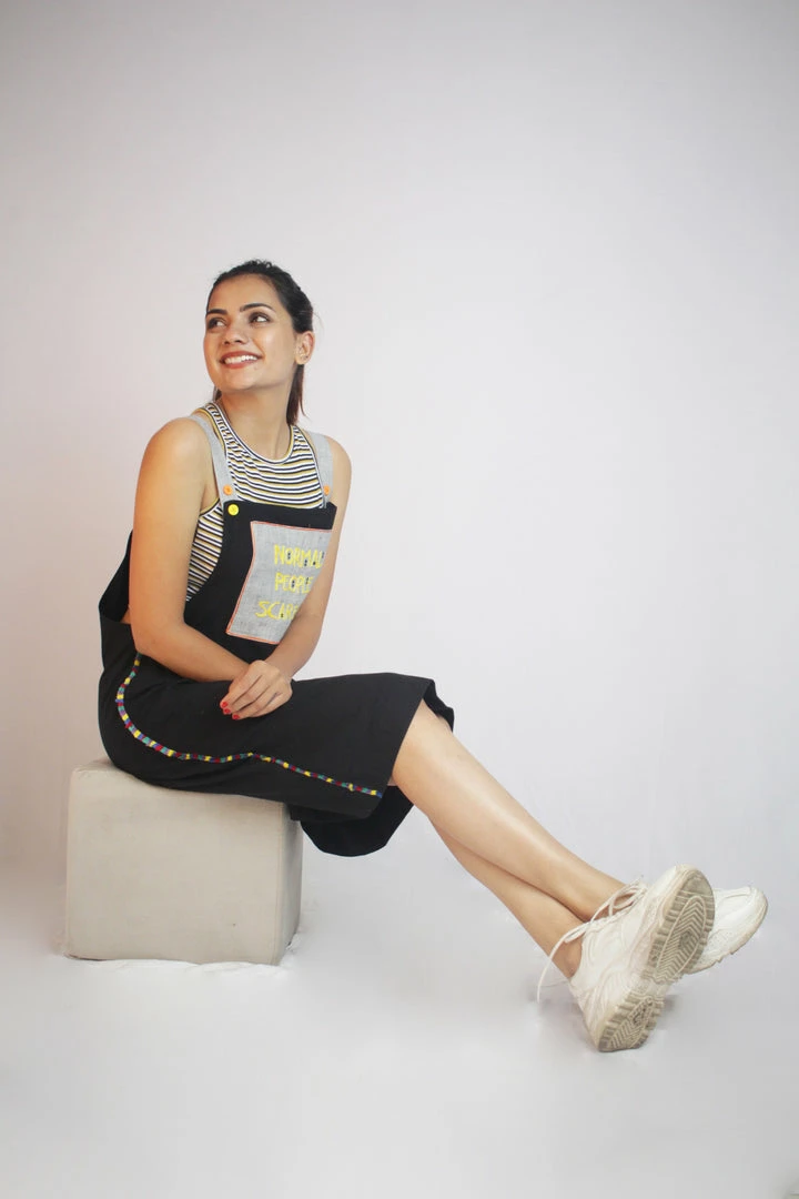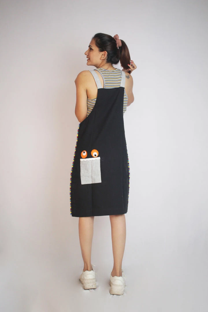 Featuring a fun and playful striped dungaree dress with a quirky applique work pocket in front and back.