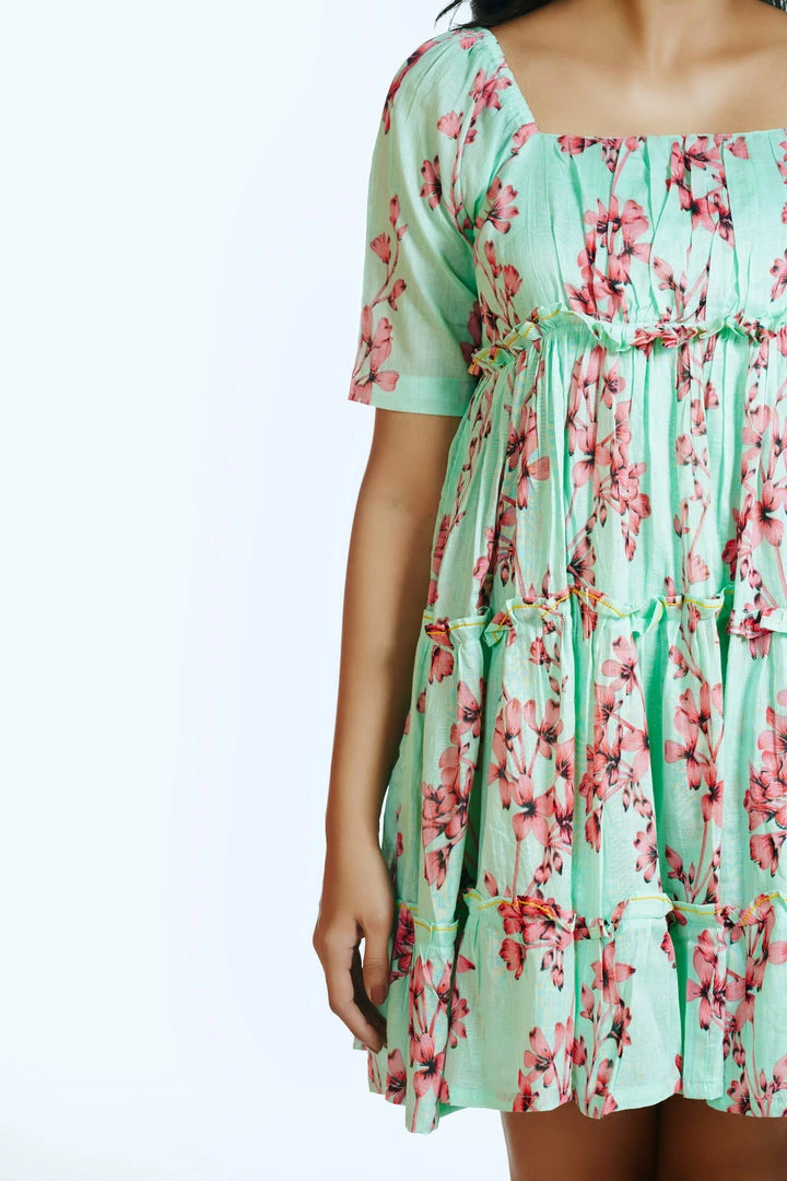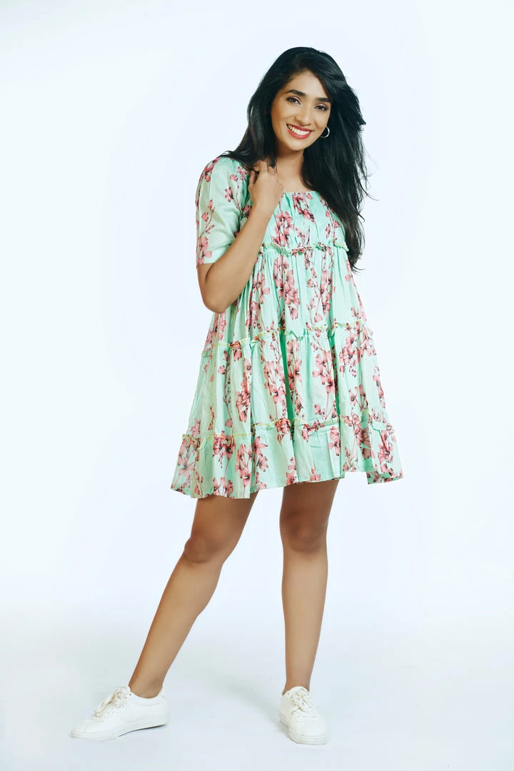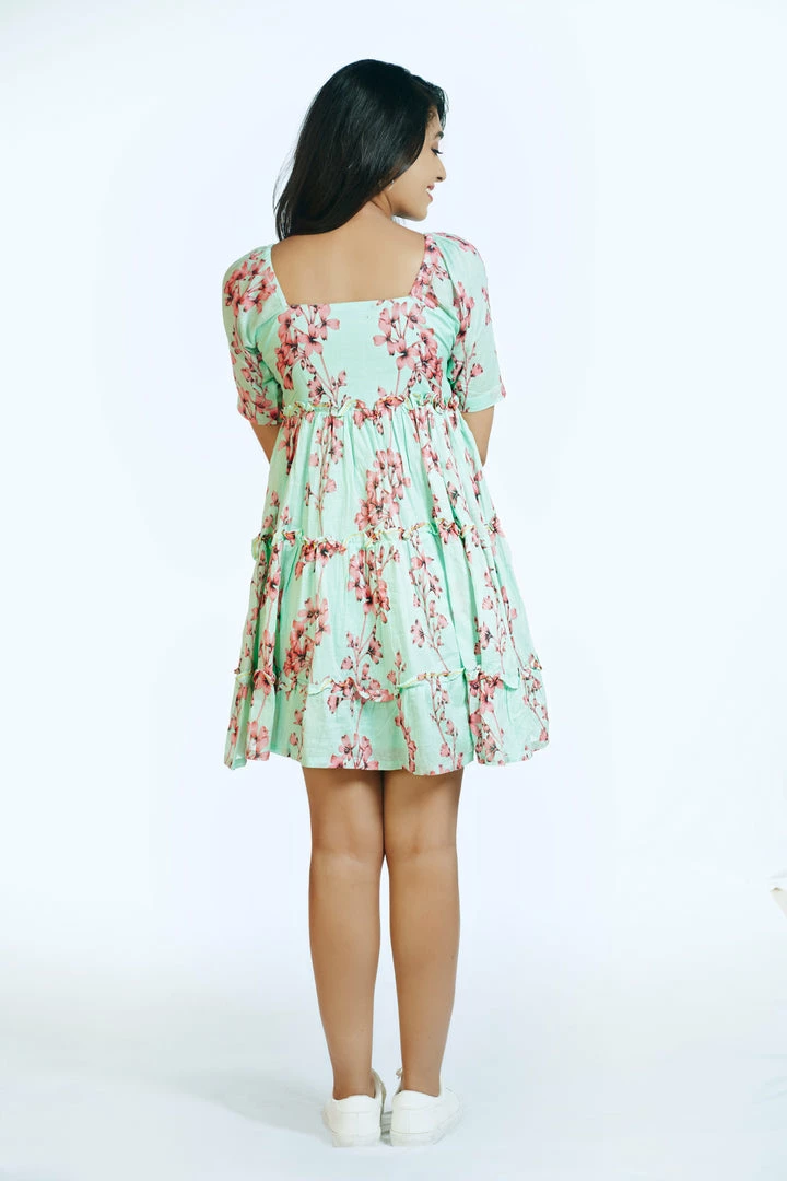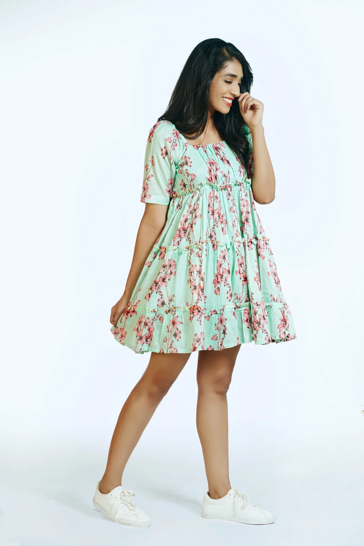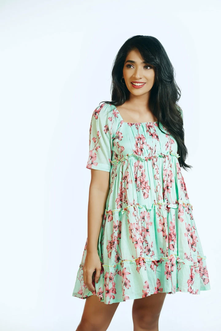 It comes with a stylist sleeves and a square neck and the contrast running stich on ruffels make it more attractive.Pair this dress with a pair of heels and a chain bag to complete the look.