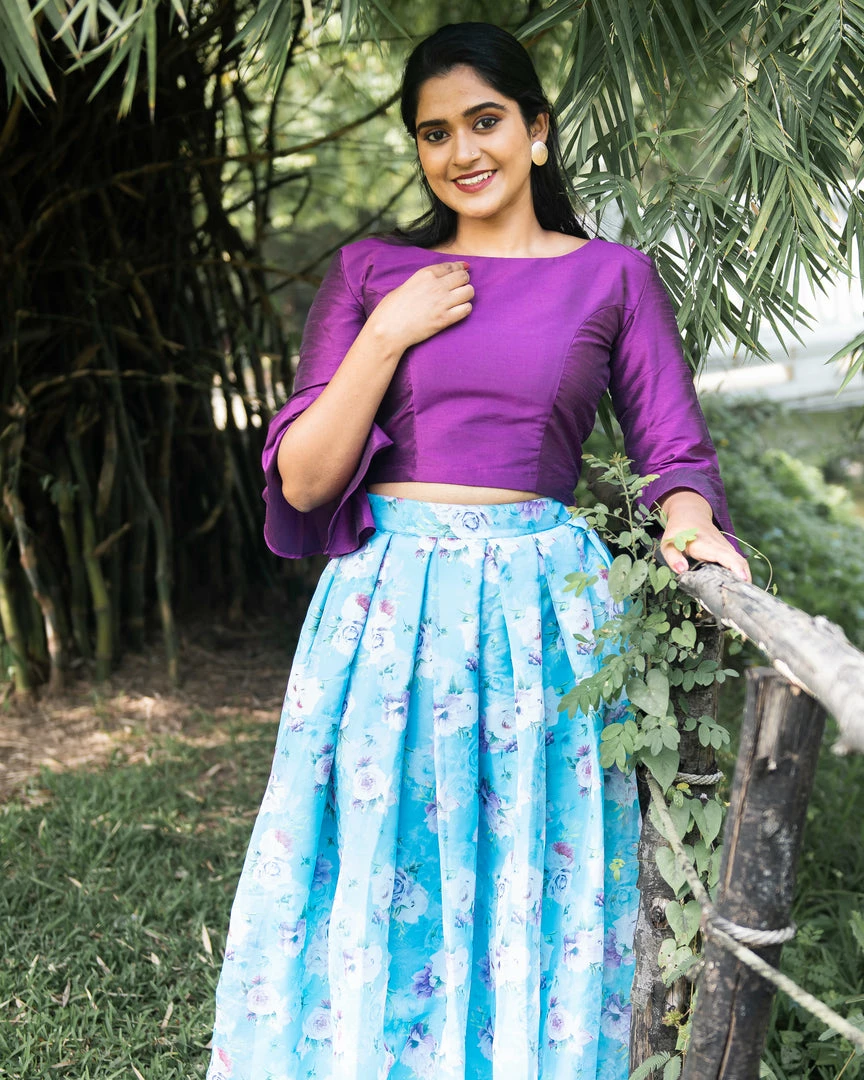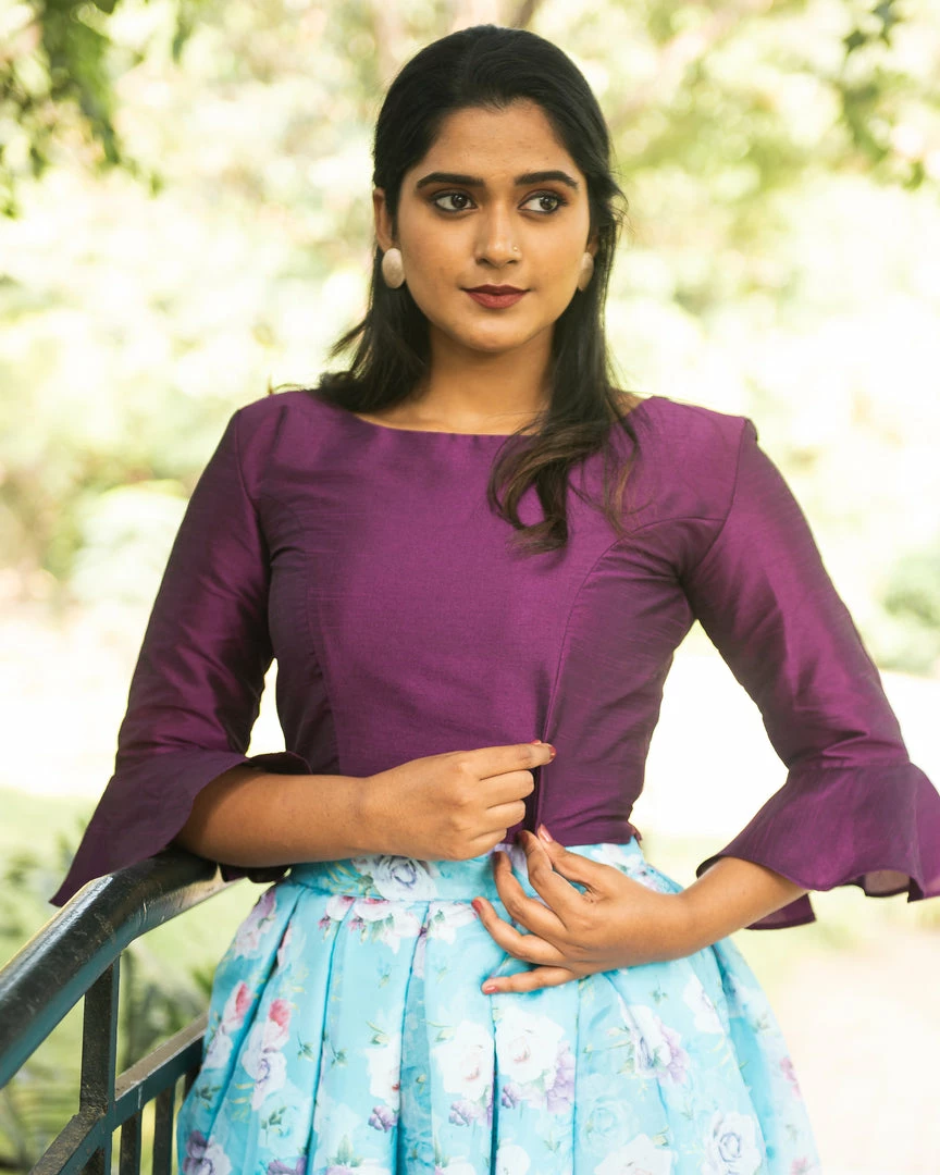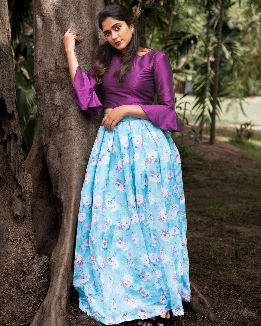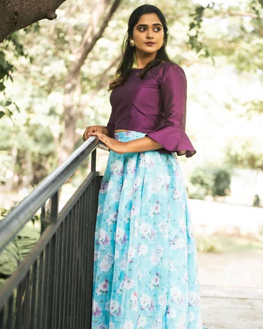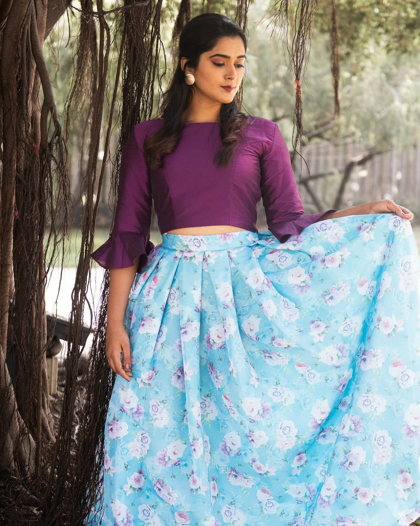 A blue printed silk organza skirt with a purple raw silk crop top – a beautiful version of the organza fabric