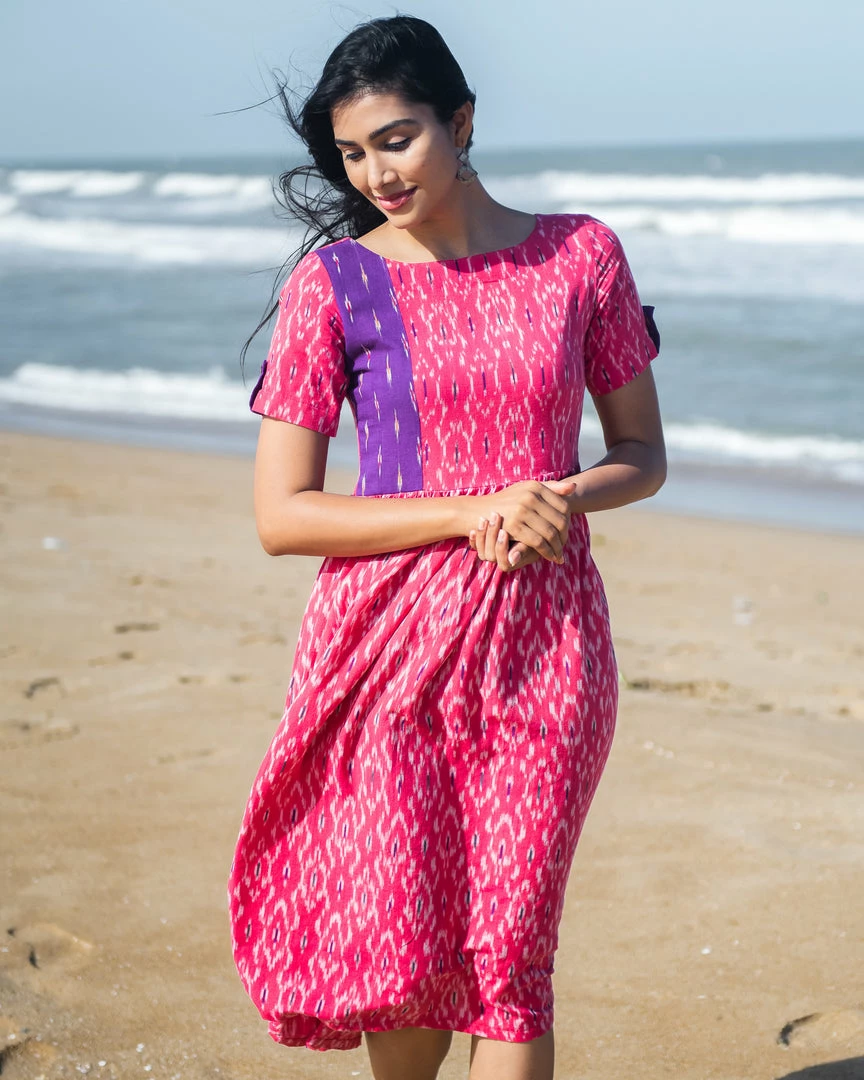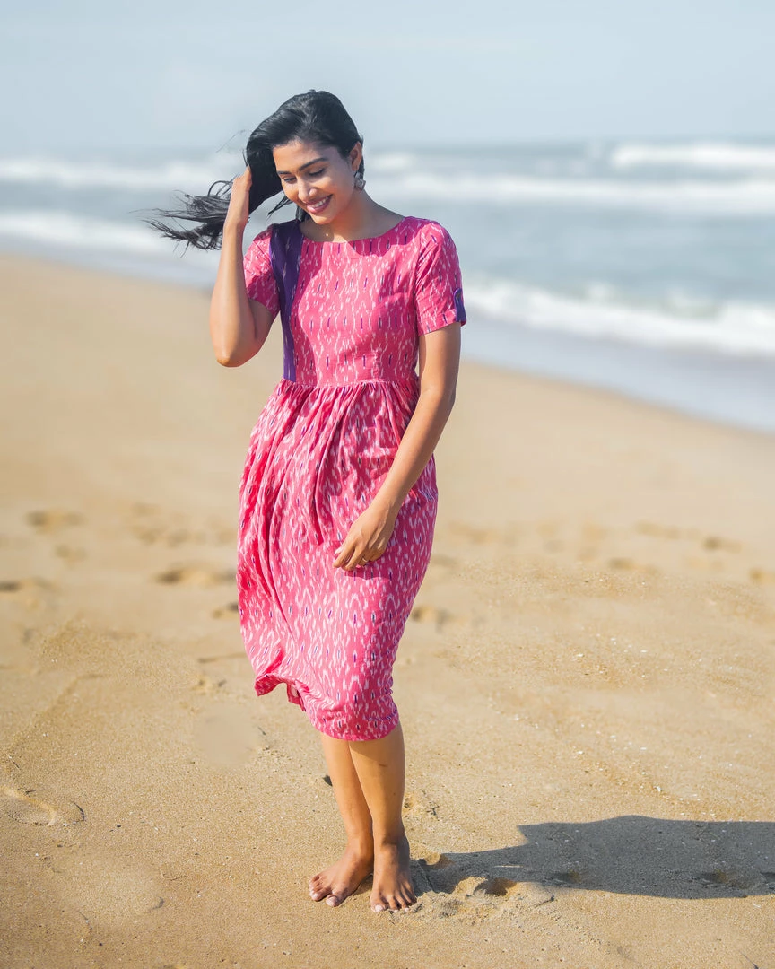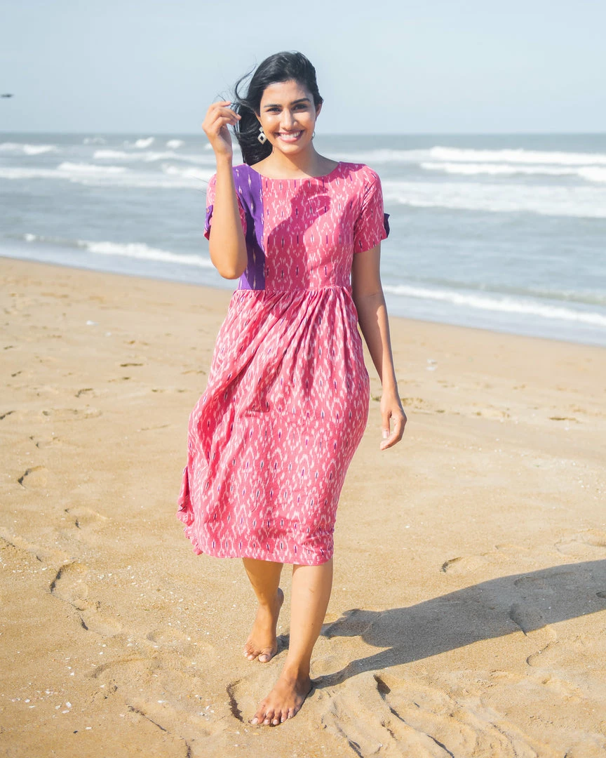 This pink Ikat dress is bright and comfortable with a touch of purple Ikat for the extra zing.