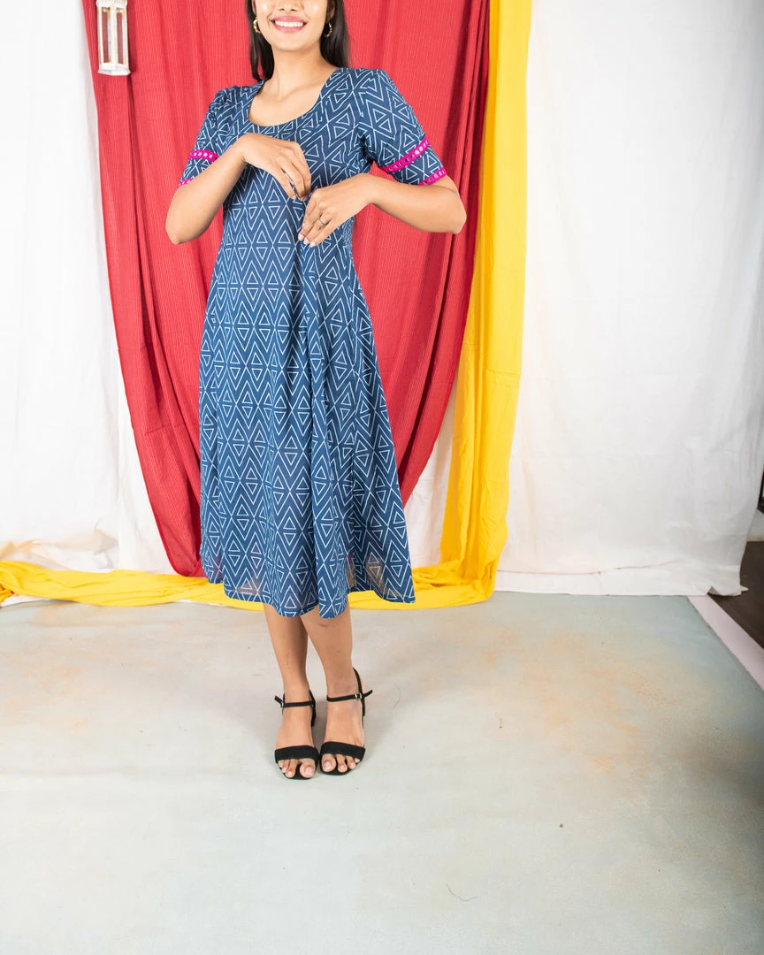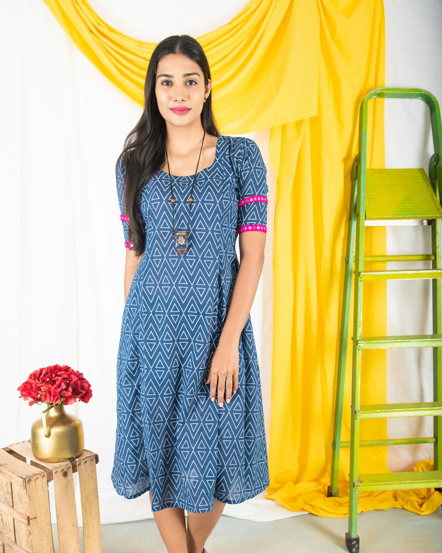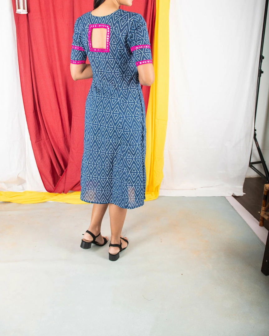 Indigo kurta with an added zing of pink lace and a peep hole!