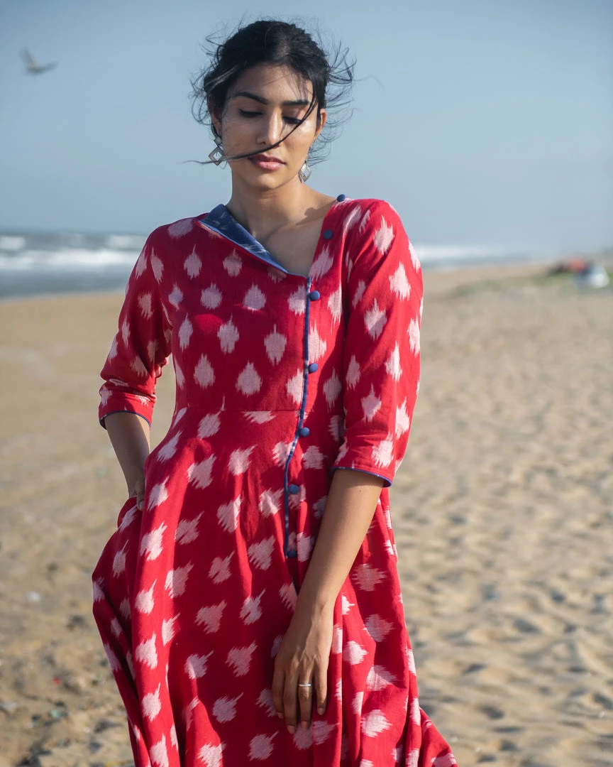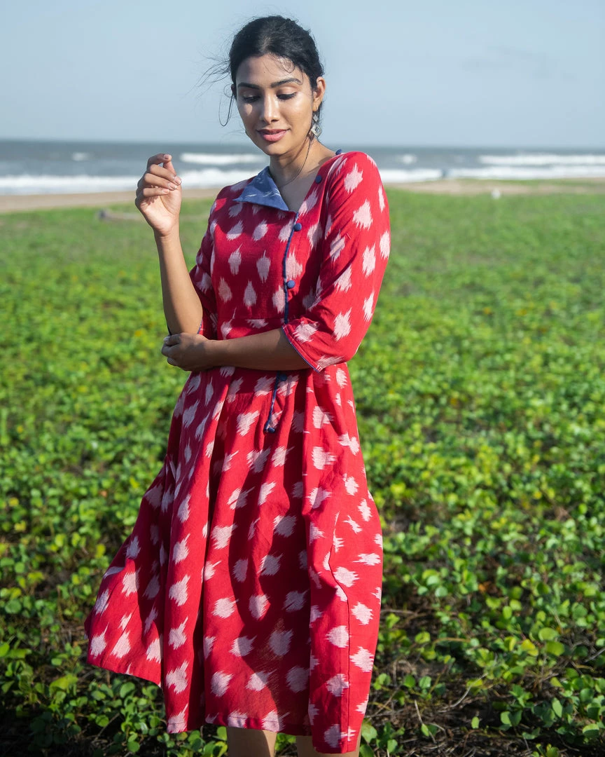 A colour everyone loves and craves for – A bright red Ikat dress to suit your contemporary mood!