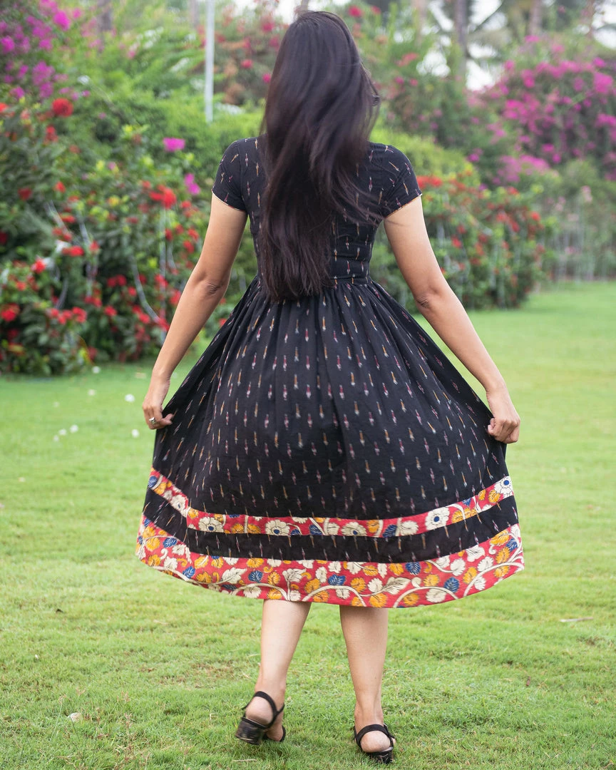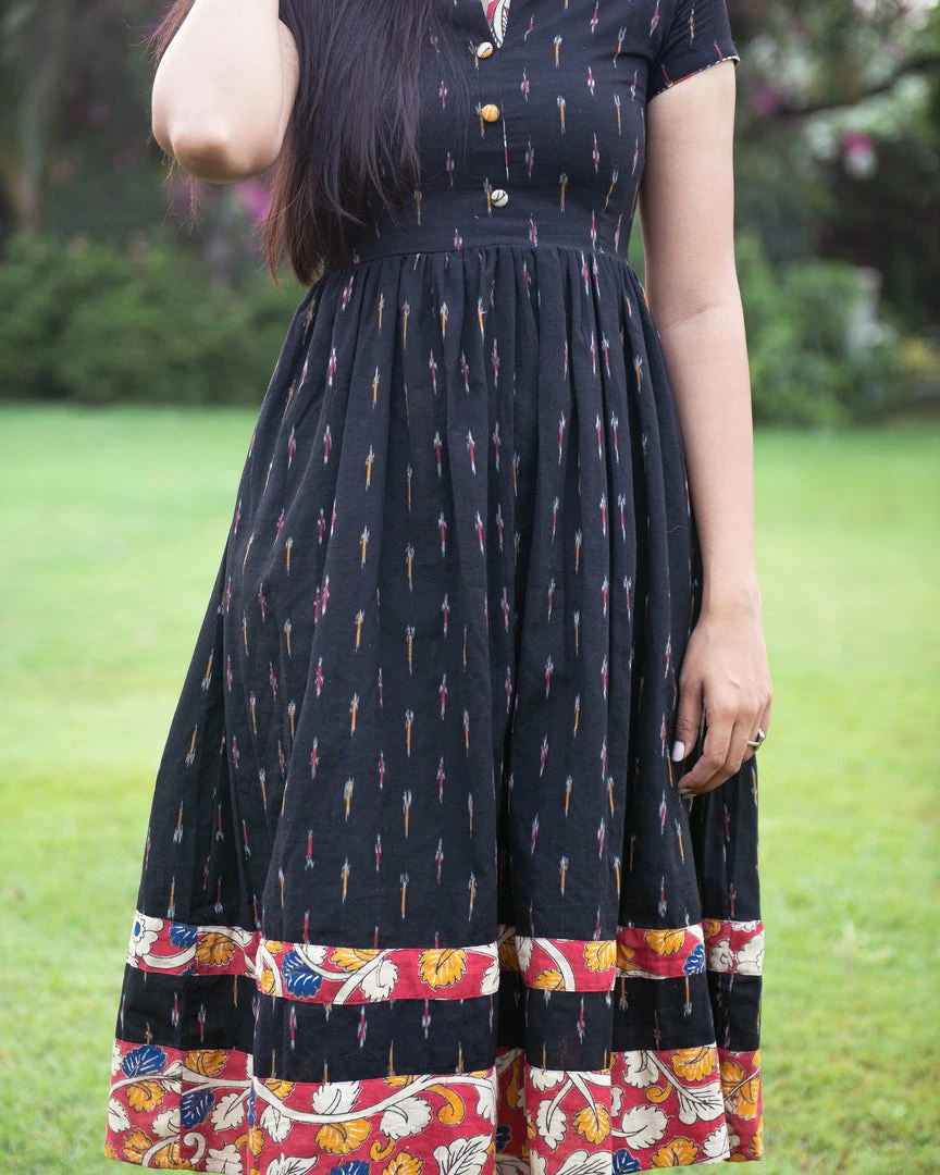 This black Ikat dress is bright comfortable cotton dress with an extra pop of yellow to brighten your day.
