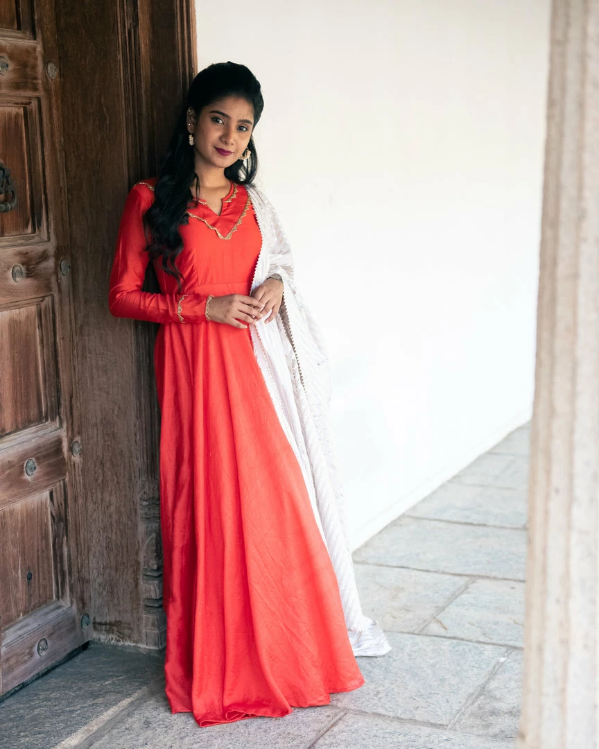 An elegant red silk anarkali paired with silk chanderi grey dupatta – to make a statement effortlessly!